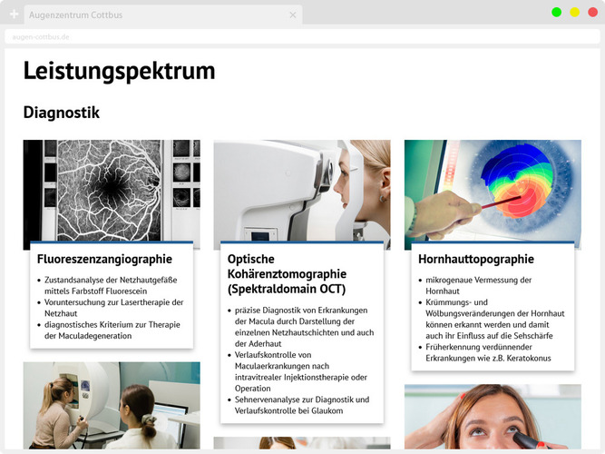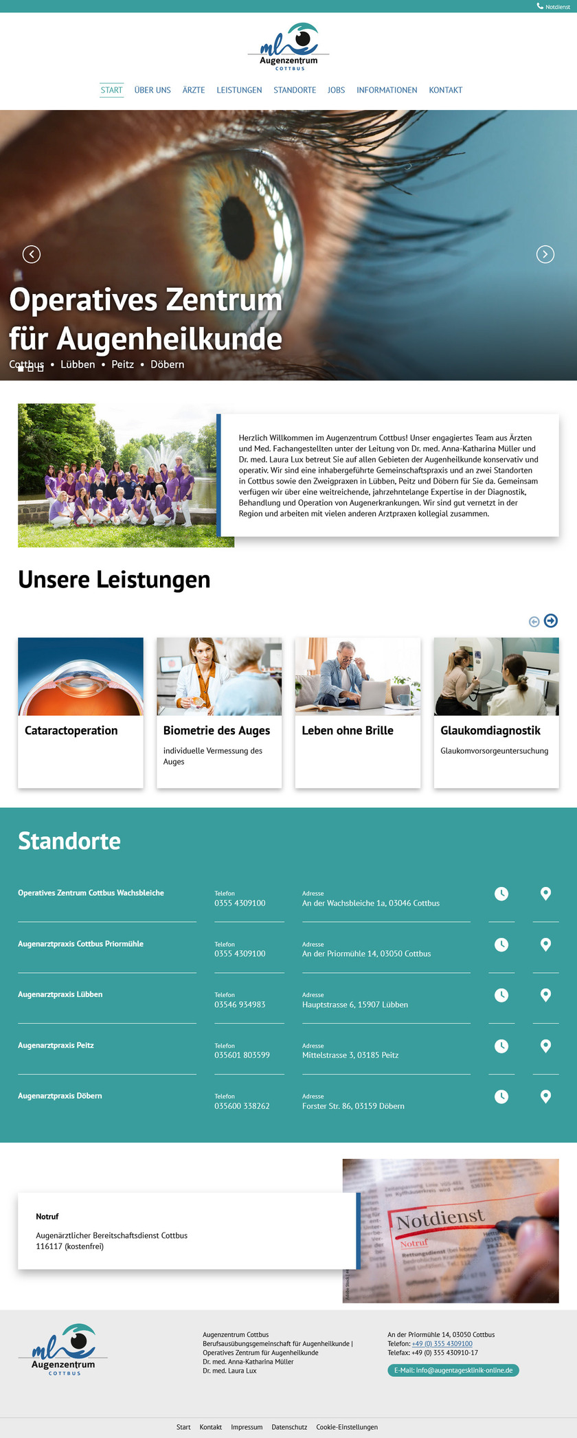 Herzlich Willkommen im Augenzentrum Cottbus! Unser engagiertes Team aus Ärzten und Med. Fachangestellten unter der Leitung von Dr. med. Anna-Katharina Müller und Dr. med. Laura Lux betreut Sie auf allen Gebieten der Augenheilkunde konservativ und operativ.