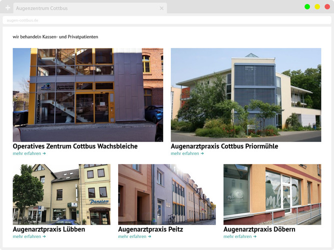Wir sind eine inhabergeführte Gemeinschaftspraxis und an zwei Standorten in Cottbus sowie den Zweigpraxen in Lübben, Peitz und Döbern für Sie da. Gemeinsam verfügen wir über eine weitreichende, jahrzehntelange Expertise in der Diagnostik, Behandlung und Operation von Augenerkrankungen. Wir sind gut vernetzt in der Region und arbeiten mit vielen anderen Arztpraxen kollegial zusammen.