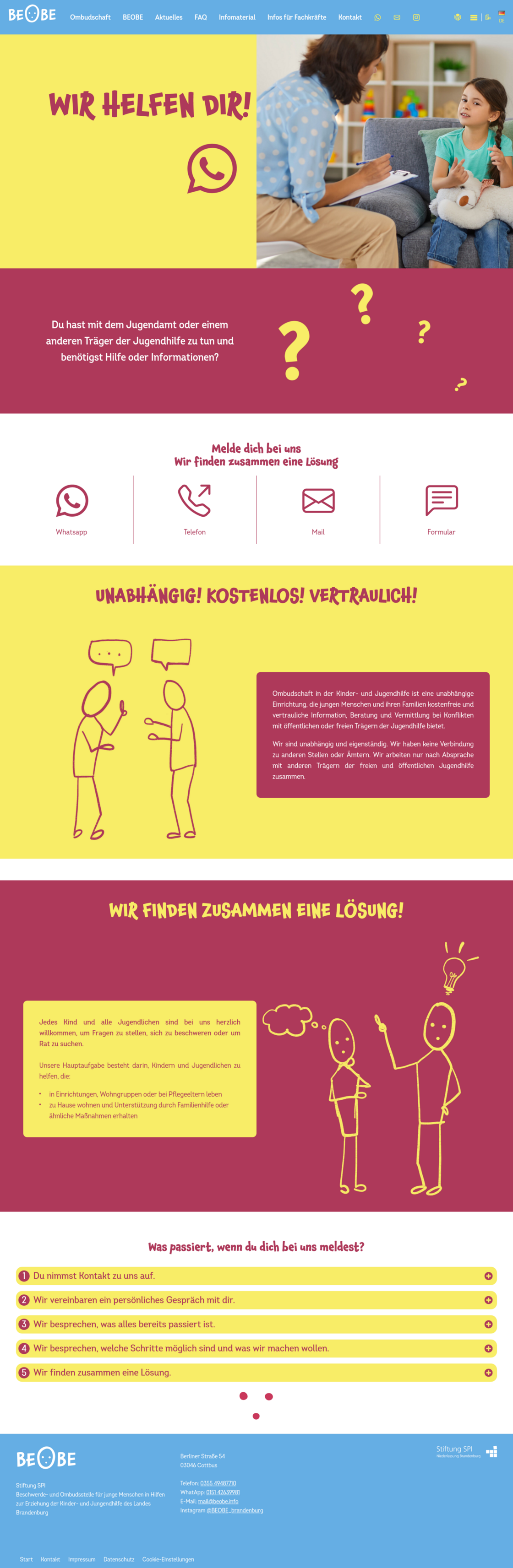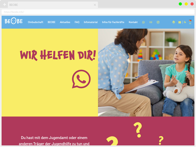 Herzlich willkommen bei BEOBE der Beschwerde- und Ombudsstelle für junge Menschen in Hilfen zur Erziehung der Kinder- und Jugendhilfe des Landes Brandenburg! Eine Ombudsstelle in der Kinder- und Jugendhilfe ist eine unabhängige Stelle, die dazu da ist, euch und euren Familien bei Fragen und Problemen in Bezug auf die Kinder- und Jugendhilfe zu helfen. Ihr könnt dort anrufen, eine E-Mail schreiben oder die Mitarbeitenden persönlich treffen. Die Beratungen sind kostenlos und vertraulich. Die Hauptaufgabe der Ombudsstelle besteht darin, euch in Konfliktsituationen mit einem freien oder öffentlichen Träger zu unterstützen.
