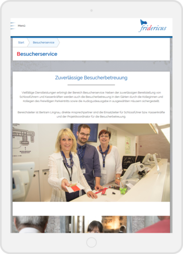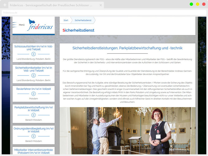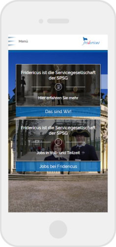 Seit 2006 erbringt Fridericus eine Reihe von Dienstleistungen in den Schlössern und weiteren Liegenschaften und Parkanlagen der SPSG. Dazu gehört neben der Organisation von Schlossführungen, Kassen-, Aufsichts- und Bewachungsleistungen die Durchführung der Gebäudereinigung für 72 historische Gebäude.