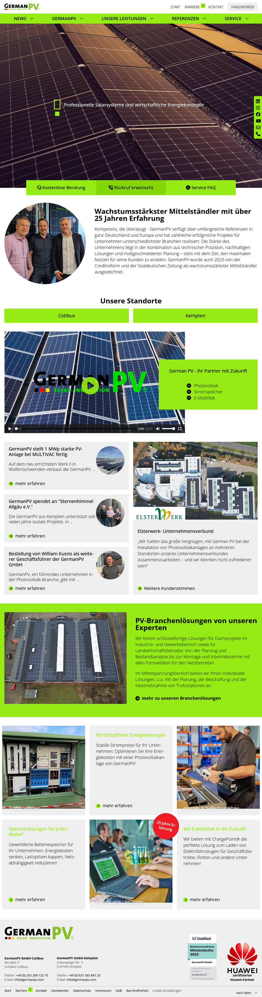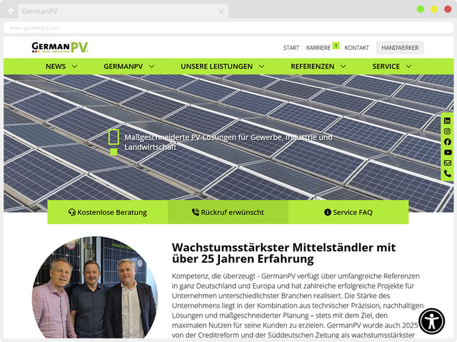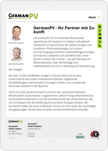 2024 und 2025 wurde GermanPV als einer der „wachstumsstärksten Mittelständler Deutschlands" ausgezeichnet. Diese Ehrung unterstreicht das kontinuierliche Wachstum und die Innovationskraft des Unternehmens, das sich konsequent für die Förderung erneuerbarer Energien einsetzt. Mit GermanPV haben Sie einen erfahrenen Partner an Ihrer Seite, der nachhaltige Energielösungen mit höchster Qualität und Wirtschaftlichkeit verbindet.