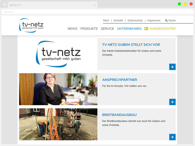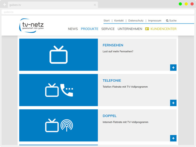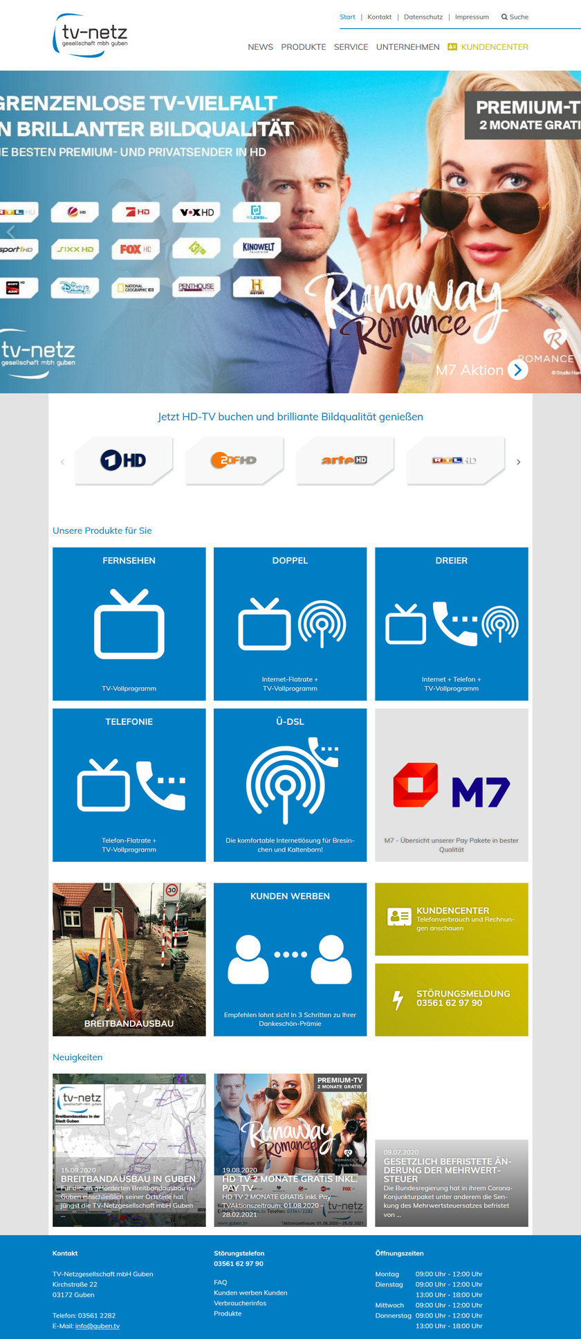 Die TV-Netzgesellschaft mbH Guben bietet ihren Kunden ein umfassendes Paket im Bereich der Kommunikation an. Neben über 300 digital empfangbaren Fernsehsendern, darunter natürlich auch HDTV-Sender, über 72 digitalen Radiosendern, kann der Kunde im Bereich Internet ein für Ihn maßgeschneidertes Kombi-Paket auswählen.