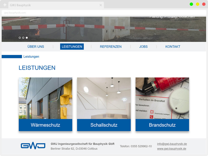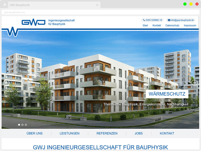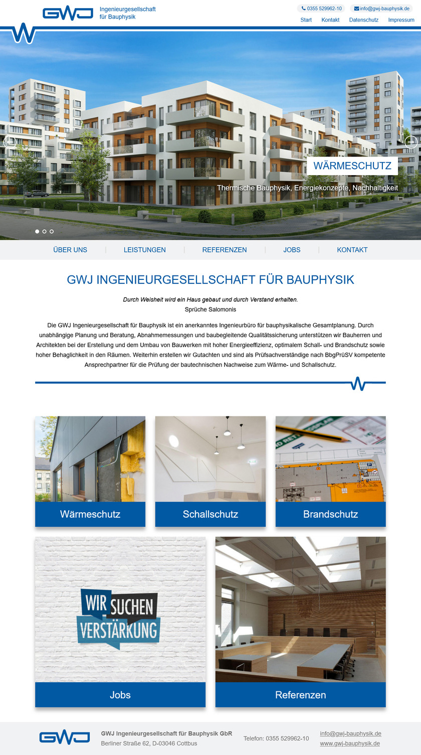 Die GWJ Ingenieurgesellschaft für Bauphysik ist ein anerkanntes Ingenieurbüro für bauphysikalische Gesamtplanung. Durch unabhängige Planung und Beratung, Abnahmemessungen und baubegleitende Qualitätssicherung unterstützen wir Bauherren und Architekten bei der Erstellung und dem Umbau von Bauwerken mit hoher Energieeffizienz, optimalem Schall- und Brandschutz sowie hoher Behaglichkeit in den Räumen. Weiterhin erstellen wir Gutachten und sind als Prüfsachverständige nach BbgPrüSV kompetente Ansprechpartner für die Prüfung der bautechnischen Nachweise zum Wärme- und Schallschutz.