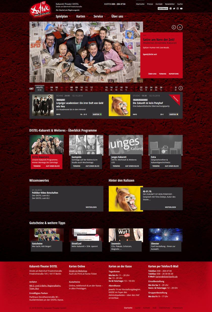 Die DISTEL ist das größte Ensemble-Kabarett Deutschlands. Längst legendär gilt das Kabarett heute deutschlandweit als erste Adresse für politische Satire. Die Nähe zu Reichstag und Kanzleramt begreift die DISTEL als Anreiz, der scharfe „Stachel am Regierungssitz“ zu sein. Seit August 1991 ist die DISTEL ein privates Theater. Jährlich unterhält die DISTEL über 100.000 Besucher in Berlin und auf Tourneen. Die DISTEL liegt im Herzen des East End Theaterviertels, Berlins dichtester Kulturmeile rund um die Friedrichstraße.