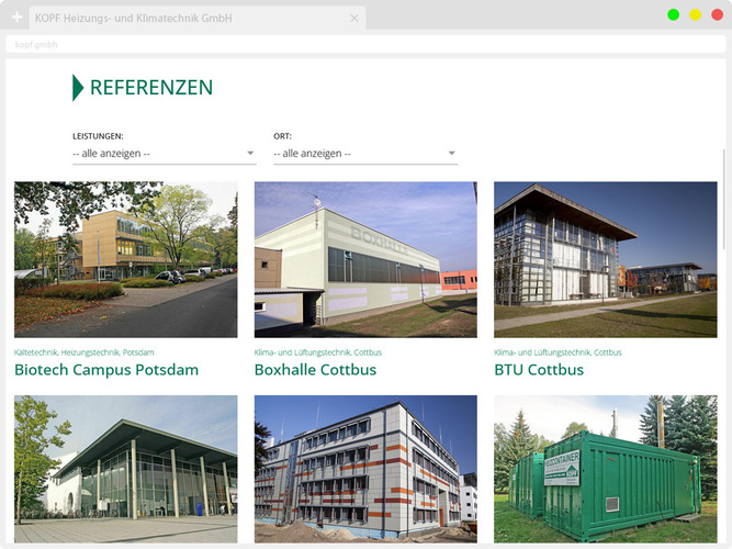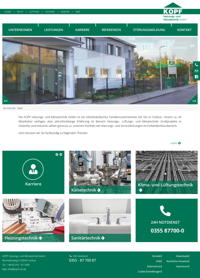 Die KOPF Heizungs- und Klimatechnik GmbH ist ein mittelständisches Familienunternehmen mit Sitz in Cottbus. Unsere ca. 40 Mitarbeiter verfügen über jahrzehntelange Erfahrung im Bereich Heizungs-, Lüftungs- und Klimatechnik. Großprojekte in Gewerbe und Industrie zählen genauso zu unserem Portfolio wie Wartungs- und Serviceleistungen im Einfamilienhausbereich.