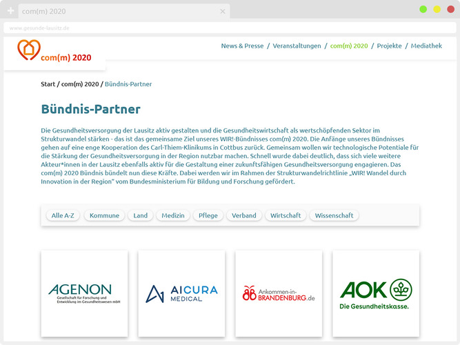 Die Gesundheitsversorgung der Lausitz aktiv gestalten und die Gesundheitswirtschaft als wertschöpfenden Sektor im Strukturwandel stärken – das ist das gemeinsame Ziel unseres WIR!-Bündnisses com(m) 2020. Die Anfänge unseres Bündnisses gehen auf eine enge Kooperation des Carl-Thiem-Klinikums in Cottbus, dem größten Krankenhaus der Maximalversorgung in Brandenburg, und der BTU Cottbus-Senftenberg, der einzigen technischen Universität des Landes, zurück. Gemeinsam wollen wir technologische Potentiale für die Stärkung der Gesundheitsversorgung in der Region nutzbar machen. Schnell wurde dabei deutlich, dass sich viele weitere Akteur*innen in der Lausitz ebenfalls aktiv für die Gestaltung einer zukunftsfähigen Gesundheitsversorgung engagieren. Das com(m) 2020 Bündnis bündelt nun diese Kräfte. Dabei werden wir im Rahmen der Strukturwandelrichtlinie „WIR! Wandel durch Innovation in der Region" vom Bundesministerium für Bildung und Forschung gefördert.
