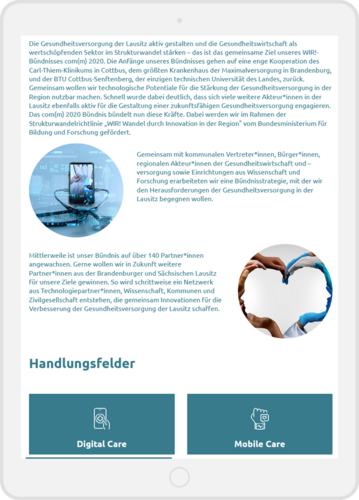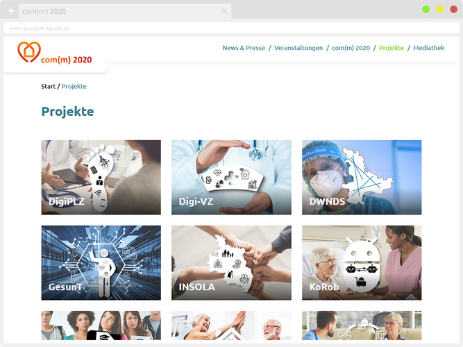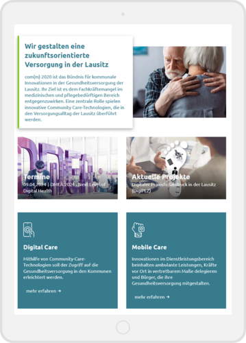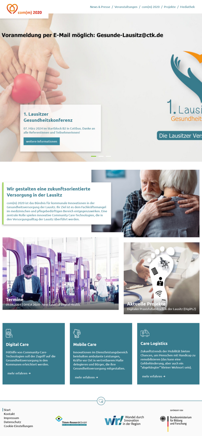 com(m) 2020 ist das Bündnis für kommunale Innovationen in der Gesundheitsversorgung der Lausitz. Ihr Ziel ist es dem Fachkräftemangel im medizinischen und pflegebedürftigen Bereich entgegenzuwirken. Eine zentrale Rolle spielen innovative Community Care-Technologien, die in den Versorgungsalltag der Lausitz überführt werden.