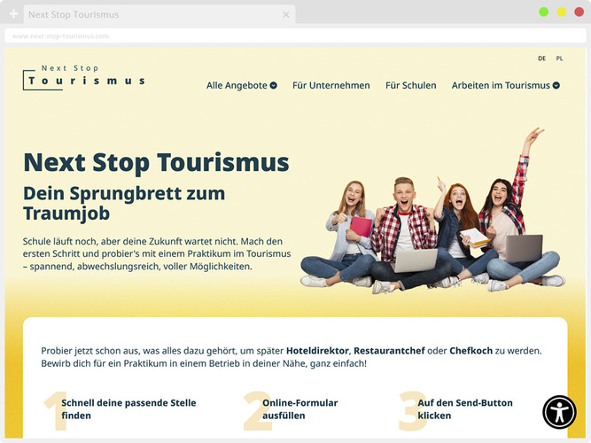 Mit Next Stop Tourismus unterstützen Sie Ihre Schülerinnen und Schüler unkompliziert bei der Suche nach Praktikumsplätzen, Ausbildungsstellen oder Ferienjobs in der Branche. Die Plattform lässt sich leicht in den Unterricht einbinden, kann in Elternversammlungen vorgestellt oder über unseren Informationsflyer direkt an die Klassen weitergegeben werden.