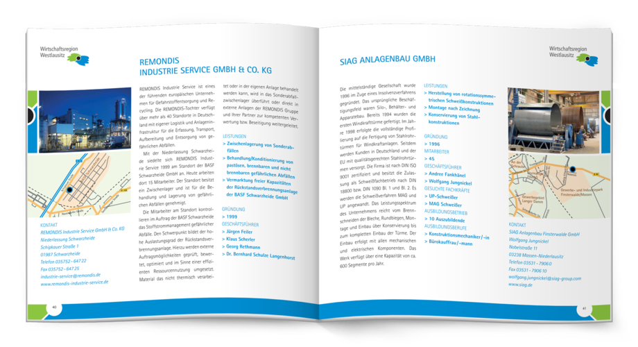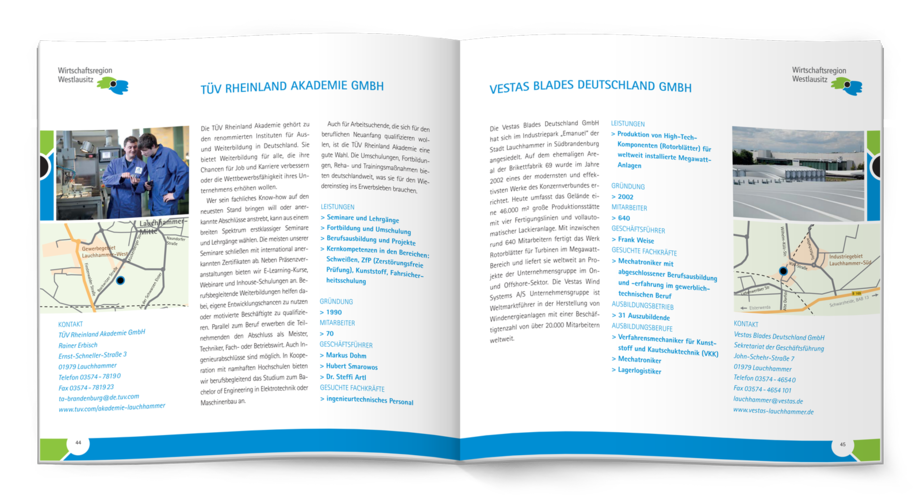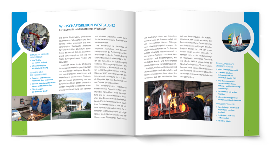 - Gestaltung, Satz und Druck von 5 verschiedenen Imagebroschüren für die Städte der Wirtschaftsregion Westlausitz: Finsterwalde, Großräschen, Lauchhammer, Senftenberg und Schwarzheide