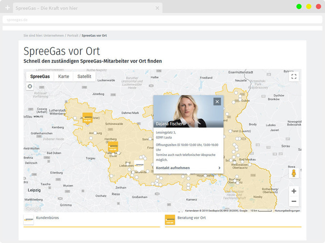 - interaktive Karte mit Standorten zur Vor-Ort-Beratung, Kundenbüros und Erdgastankstellen