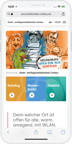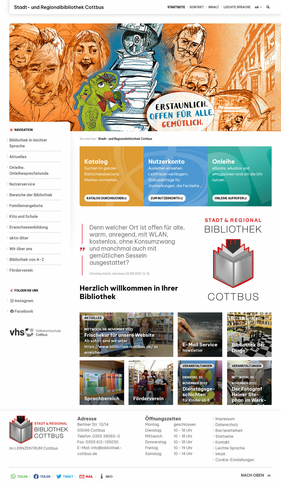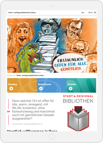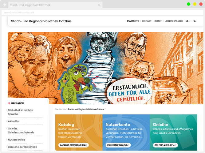 Den Besuchern präsentiert sich die neue Website in einem modernen und individuellen „Outfit“. Die Banner-Zeichnung der Dresdener Grafikdesignerin Gabriele Schluttig auf der Startseite zeigt zufriedene Bibliotheksnutzer aller Generationen und nimmt mit den Worten „erstaunlich, offen für alle, gemütlich“ vorweg, was die Cottbuser städtische Bibliothek ausmacht.