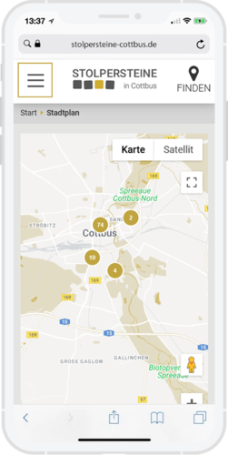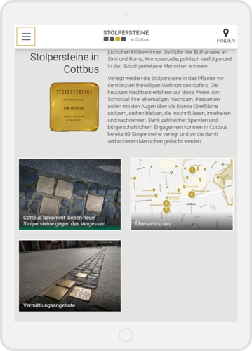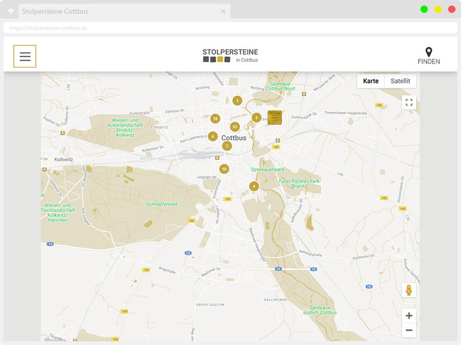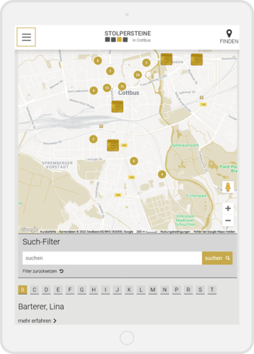• interaktive Karte mit der Darstellung aller Cottbuser Stolpersteine inkl. Biografien und A-Z Filter