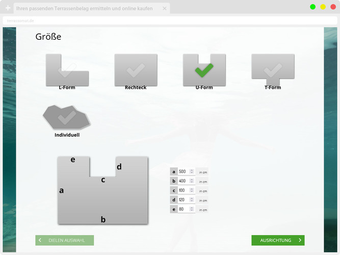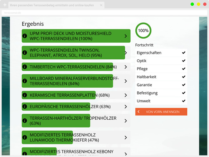 Der Terrassomat ist der Terrassenplaner mit dem Sie in kürzester Zeit das für sie geeignete Terrassendeck analysieren, die Terrasse planen und sich selbst ein Angebot erstellen können in dem alles enthalten ist was sie für den Bau Ihrer neuen Terrasse benötigen.